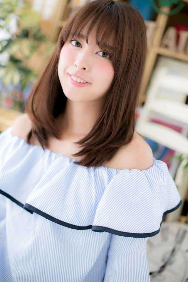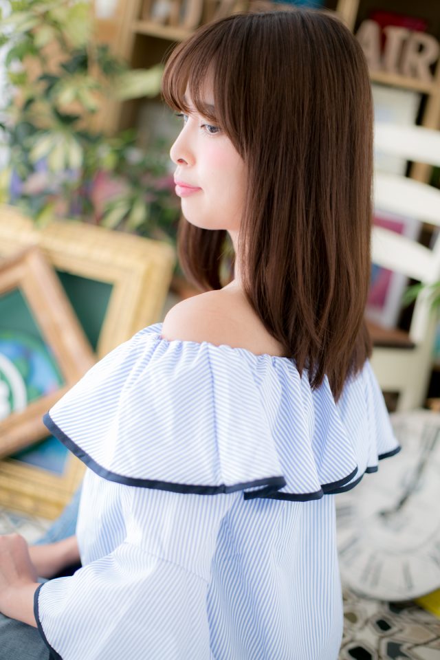暗髪ローレイヤーの重めスタイルは、透け感ある斜めバングとツヤ感ワンカールで軽やかに。くせ毛風カールのふわミディや厚めバングで目力強調してもOK。耳かけも大人かわいい♪(メイク担当:北浦和店 棟方)