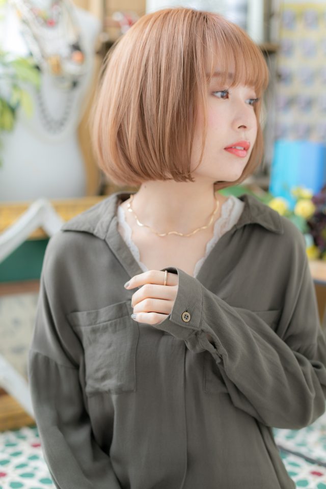 シンプルなナチュラルボブは外国人風ハイライトで個性的に。前下がりで輪郭カバーして小顔見せ。耳かけしたりくせ毛風カーリーなふわミディも大人かわいい髪型。透け感おフェロな印象が◎(メイク担当:川口店 岩淵)