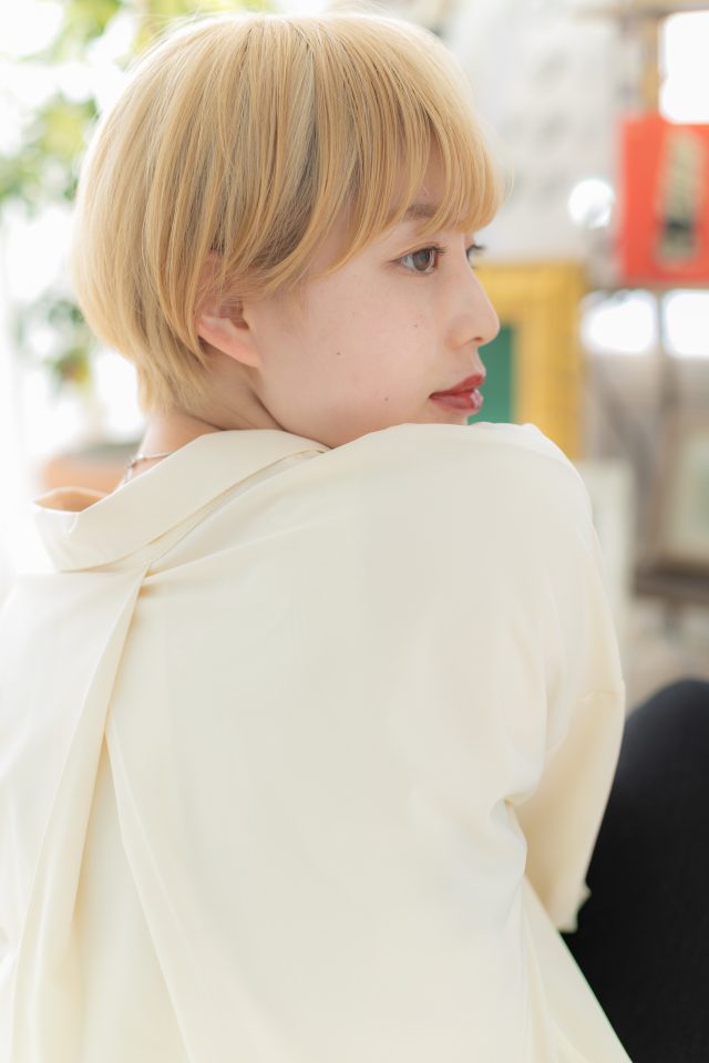 金髪ショートはナチュラルボブやフェミニンボブ、大人ボブや前下がりボブからのイメチェンに◎斜めバングや厚めバング、くせ毛風ふわミディや耳かけも大人かわいい。前下がりで小顔。(メイク担当:COVERHAIRGROUP中田)