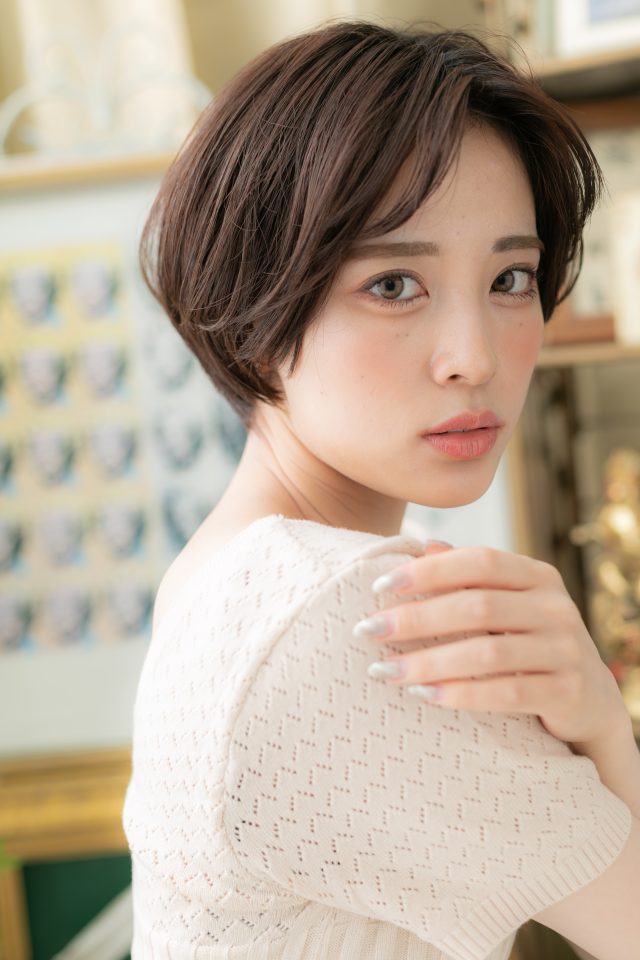 前下がりで小顔見せした丸みショート。ナチュラルボブやフェミニンボブ、大人ボブや前下がりボブ、ミニボブからのイメチェンに。斜めバングや厚めバングで目力UP。くせ毛風ゆるふわミディや耳かけウルフも大人かわいい