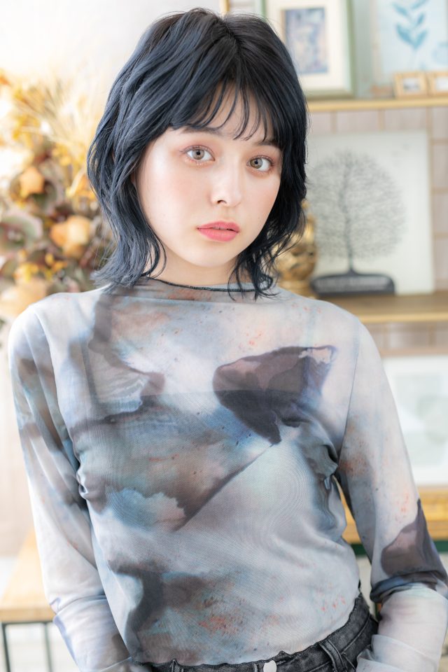 ブルーグレージュ小顔透け感ミディアムウルフ