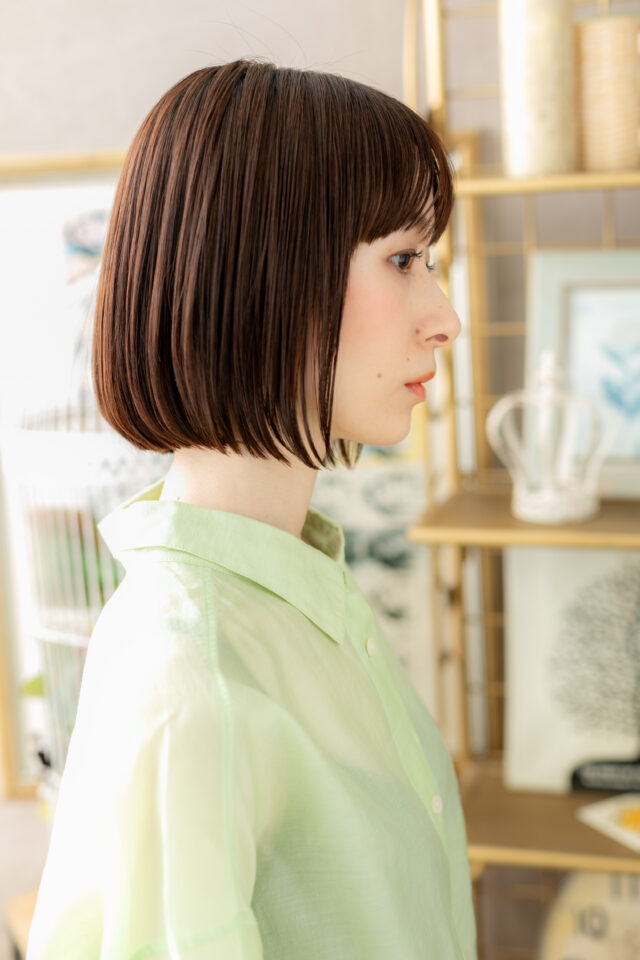 バレイヤージュ/ハイトーンカラー/ハイライトカラー/韓国風/くせ毛風/ボブ/ぱっつん前髪/丸みショート/くびれショート/伸ばしかけ/カーキベージュ/グレージュカラー/ヘルシースタイル/エアリーミディ/ナチュラル/20代/30代/40代
