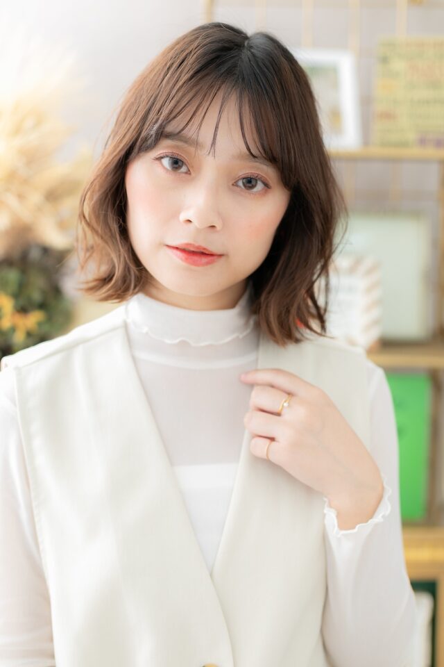 ナチュラルボブフェミニンボブ,大人ボブ前下がりボブ,マッシュボブミニボブも◎斜めバング厚めバングシースルーバングが大人かわいい。くせ毛風耳かけゆるふわミディや前下がりウルフも小顔。(メイク担当:北浦和店成田)