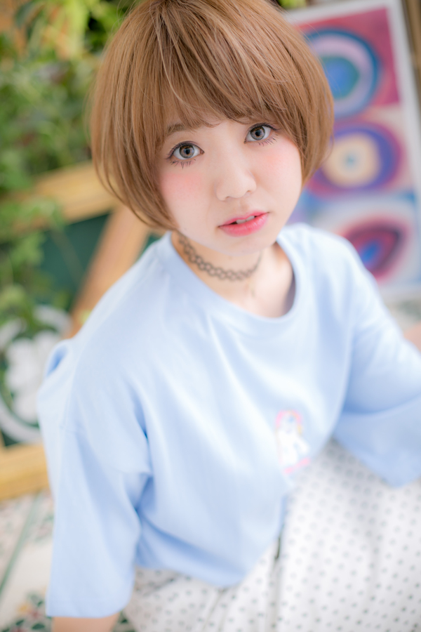 赤みのない透明感あるハイトーカラーでツヤ感を出した、コンパクトフォルムのナチュラルボブ。コロンとした可愛らしいシルエットが小頭効果も引き出します☆