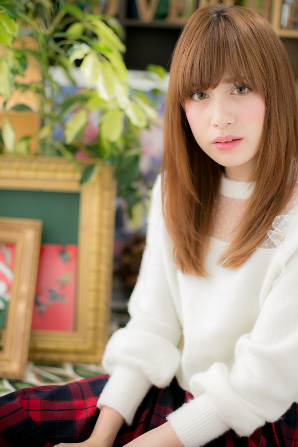 しっとりフォルムのストレートロングにハイトーンカラーでアクセントをつけました。目のラインぎりぎりのバングが目元の印象をUPさせます。
