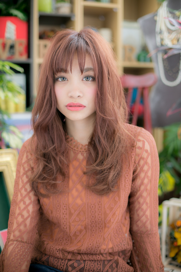 シースルーバングとピンク系カラーの合わせ技で、周囲と差の付く印象的なロングスタイルに。華やかリッチスタイルは、弾む大きめのウェーブでこなれ感を出して色っぽく仕上げてもOK☆