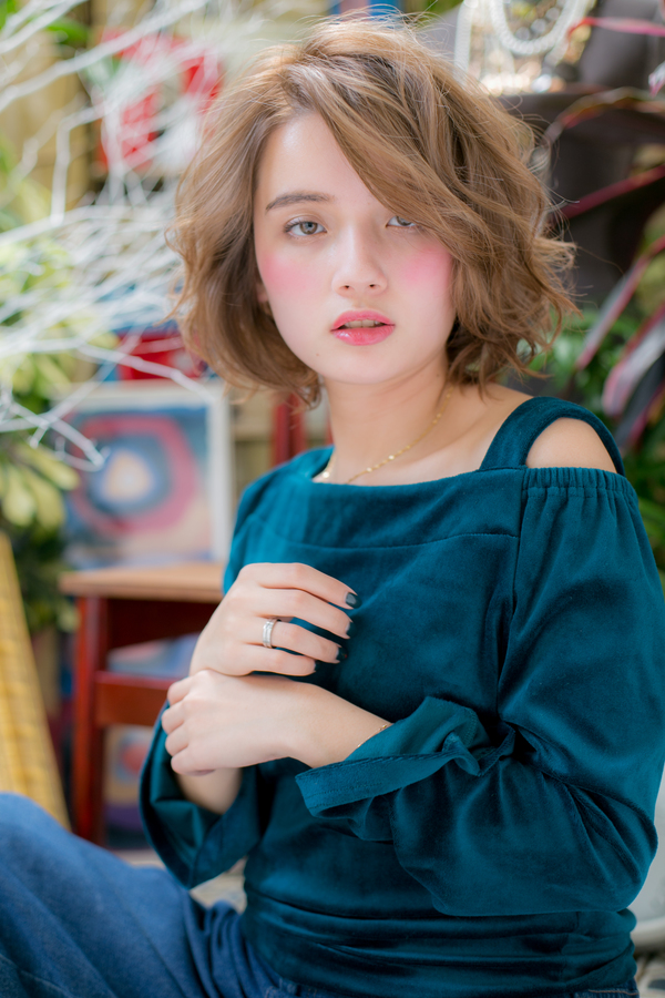 強めパーマとハイトーンがインパクト大のスパイシーミディアム。ゆるやかなラインのバングで色気を漂わせて。やわらか質感でフェミニンに仕上げれば、サイドから見ても綺麗な艶やかなピュアスタイルに。同性人気も◎