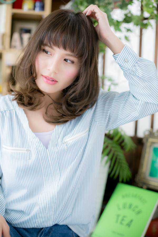 リップラインからのレイヤーに内巻きカールをオン。たわわなグラマラス感で顔周りに華やぎを添えます。あえてのショートバングであどけなさも残して、キレイ可愛い親しみやすい雰囲気に。耳かけも大人かわいい。