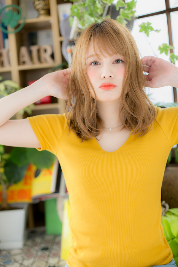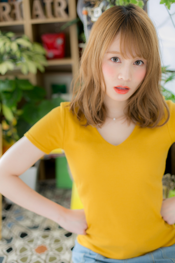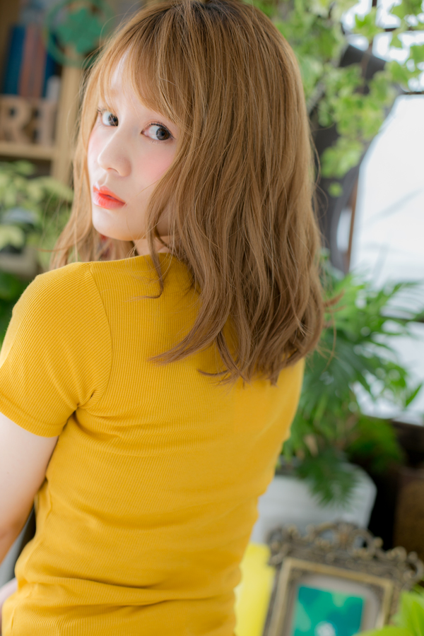 レイヤーで全体的に透け感を出し、ハイトーンカラーやわらか質感に仕上げたシルキーセミディ。ほつれウェーブのニュアンス感ある動きで、綿菓子のようなふわほわ軽い、甘めガーリーヘアに◎(メイク担当:北浦和店 棟方)