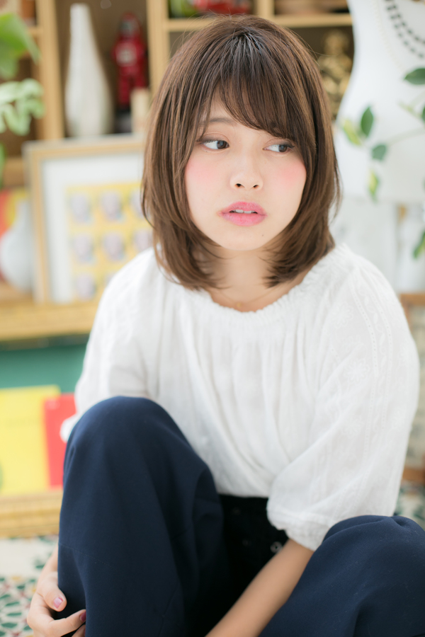 斜めバングがポイント☆ナチュラルミディを目力UPのガーリーセミディに格上げします。厚めバングやオン眉も個性的でラブガーリーで大人女子のファション度UP。くせ毛風パーマのふわミディや耳かけも◎ミディアムヘアを際立たせるグラデーションやベージュで暗めの髪の色で髪の毛の悩みも解決!40代のエラ張り対策にもおすすめ!(メイク担当:川口店 成田)