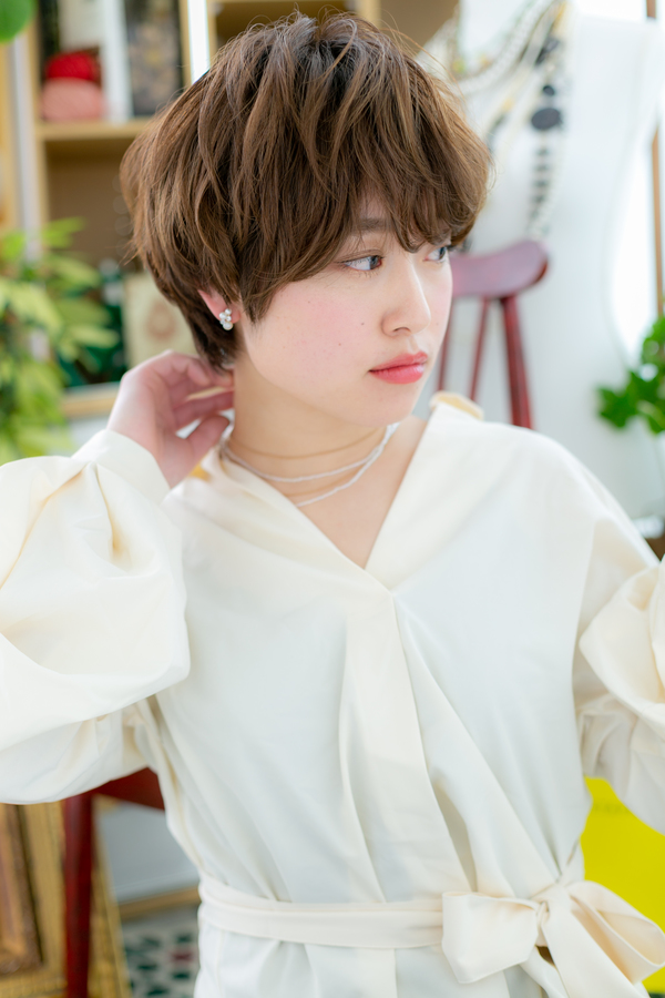 トップにボリュームを持たせてヘアスタイルUP効果を狙ったくせ毛風丸みショート。フェミニンな印象なので大人女子のショートでもエレガントに決まります。トリートメントしたようなカラーリングで髪の毛の悩みも解決!人気のカラーやピンク系のカラーもおすすめ!30代・40代にも◎(メイク担当:北浦和店 棟方)