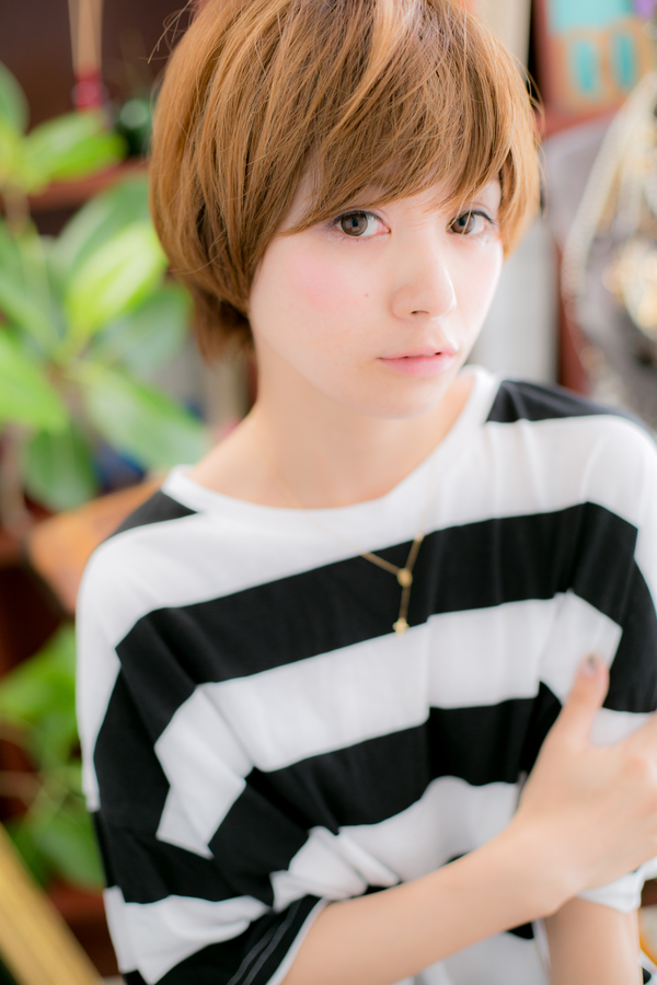 斜めバングをサイドにラウンドにつなげ、ガーリーな丸みを作って。明るいハッピーカラーをオンすれば、シンプルなマッシュショートもお気に入り潤いショートに!