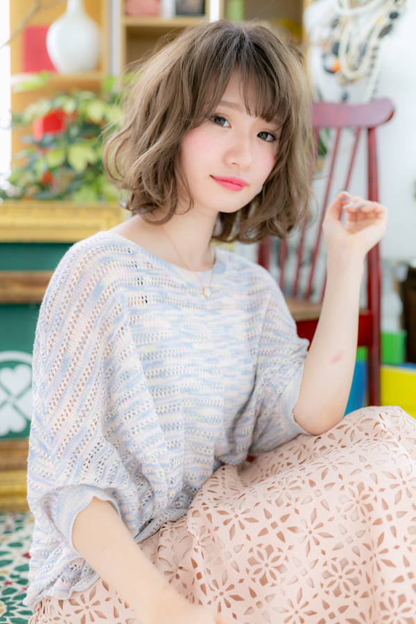 斜めバングをくせ毛風ゆらぎカールでラブガーリーに仕上げに。ミディヘアを際立たせるグラデーションやベージュの暗めの髪の色もおすすめ。前下がりで輪郭をカモフラージュして小顔で大人女子のファッション度UP。30代・40代にも◎