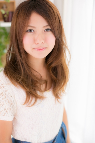 女の子の王道スタイル☆前髪を目尻に合わせ,小顔効果のあるデザイン。毛先は重く見えない柔かいシフォンカールが可愛い。オレンジベージュで,印象を変えてもGOOD。ハイトーンやグラデーションカラー,センターパート,トリートメント,伸ばしかけもご相談下さい