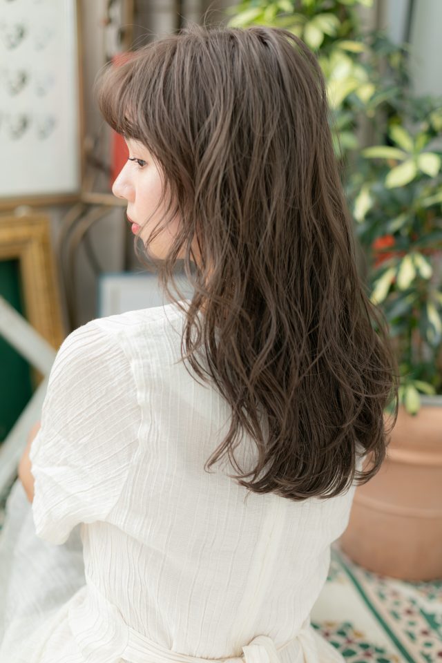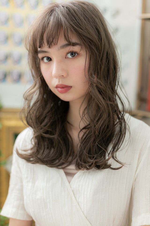 ハイトーンxくせ毛風パーマで自然に陰影ができて3Dヘアスタイルが完成。眉上バングであざとさ◎ふわミディやくびれミディからの伸ばしかけに。センターパートや耳かけも大人かわいい。(メイク担当:川口店成田)