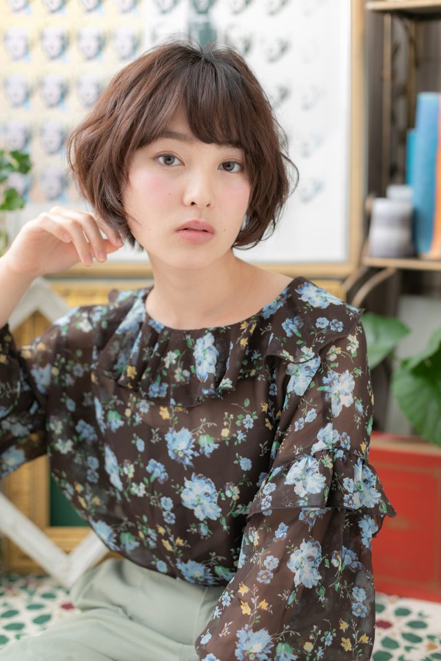 斜めバングと前下がりで小顔に仕上げたくせ毛風エアリーボブ。ナチュラルボブやフェミニンボブ、大人ボブや前下がりボブからの伸ばしかけにオススメ。アシンメトリーなヘアアレンジが◎(メイク担当:北浦和店 棟方)