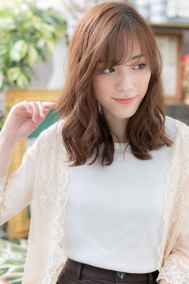 くせ毛風無造作パーマで大人かわいいこなれ感を醸したゆるふわミディのヘアスタイルで大人女子のファッション度UP。ミディアムヘアを際立てせるグラデーションもおすすめ!耳かけやかきあげも◎(メイク担当:川口店 成田)