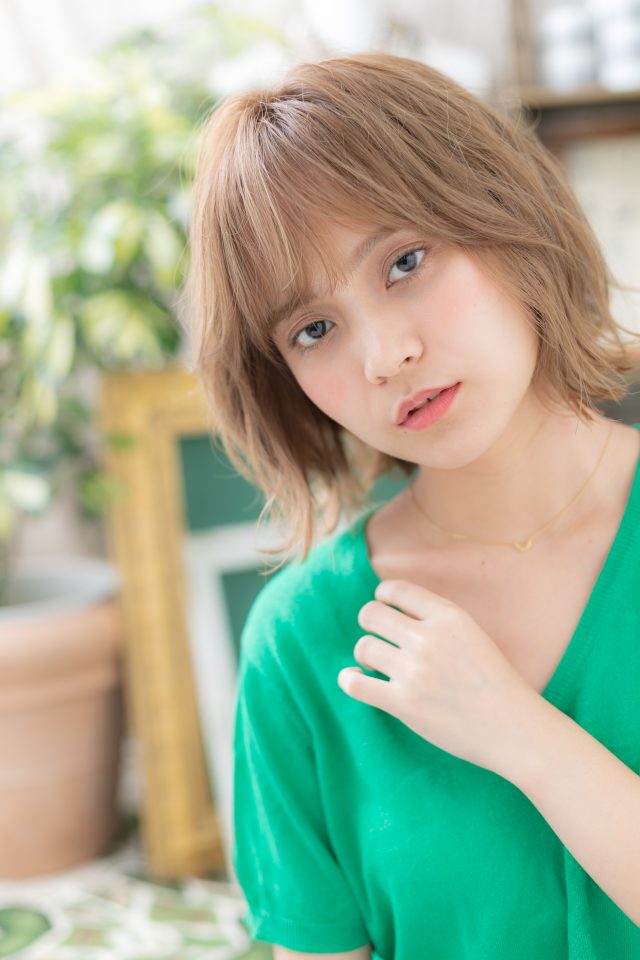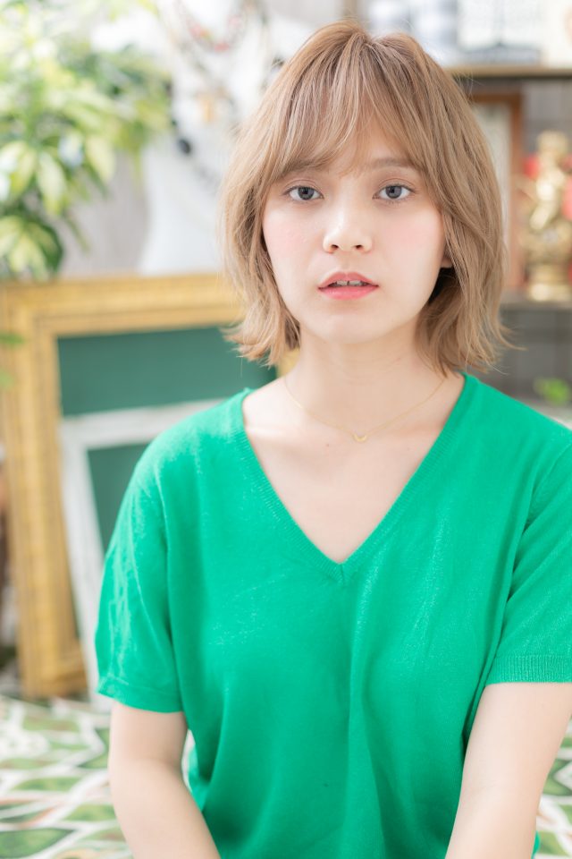 斜めバング&シースルーバングで目力強調したくせ毛風ふわミディのヘアスタイル。ミルクティーブラウンやミルキーベージュで外国人風にイメチェンが大人かわいい。ミディアムヘアを際立たせるグラデーションもおすすめ。(メイク担当:川口店 岩渕)