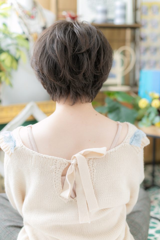 ボーイッシュに見えがちなマッシュショートをガーリーにヘアアレンジした大人ショート。くせ毛風ニュアンスカールで動きを出し黒髪風ダークカラーでシックなヘアスタイルで大人女子のファッション度UP。小顔見せ効果も◎(メイク担当:COVERHAIRGROUP中田)