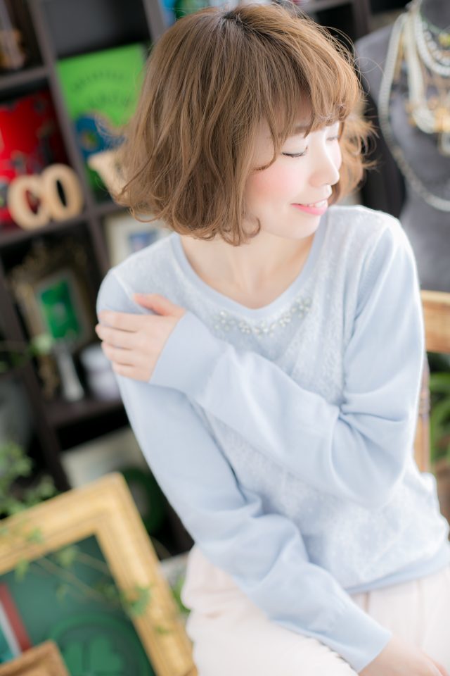 カーキベージュ大人ガーリーくせ毛風ボブルフ