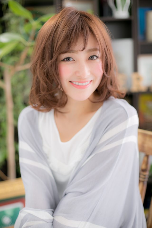 くしゅっとしたくせ毛風カールがラブなふわミディ。シースルーバングの抜け感が大人かわいい。斜めバングや厚めバングで色っぽくしたり、耳かけでフェミニンにしてもGOOD!前下がりフォルムで小顔効果も嬉しい♪
