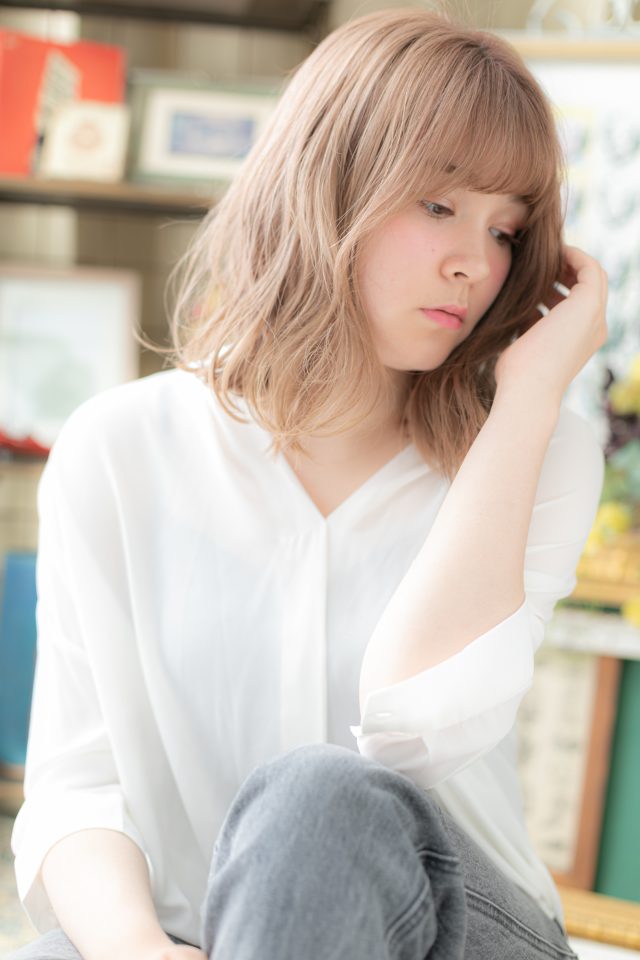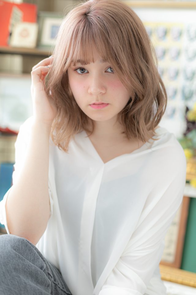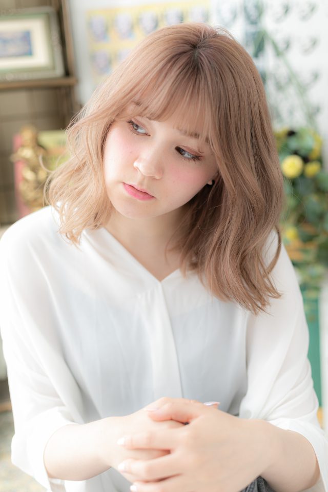 くせ毛風ゆるふわミディが大人かわいいヘアスタイル。耳かけや前下がりで小顔で大人女子のファッション度UP。ナミディアムヘアを際立たせるグラデーションもおすすめ!30代・40代にも◎(メイク担当:COVERHAIRGROUP中田)