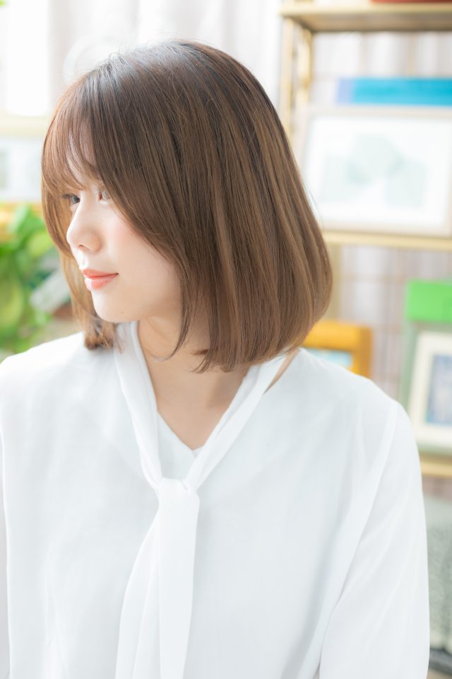 - ハイトーンカラー/切りっぱなしボブ/大人ハイライト/韓国風/ボブ/ウェットヘア/ナチュラルマッシュショート/丸みショート/オリーブアッシュ/くすみカラー/かきあげ前髪/くびれショート/エアリーミディ/ナチュラル/20代/30代/40代