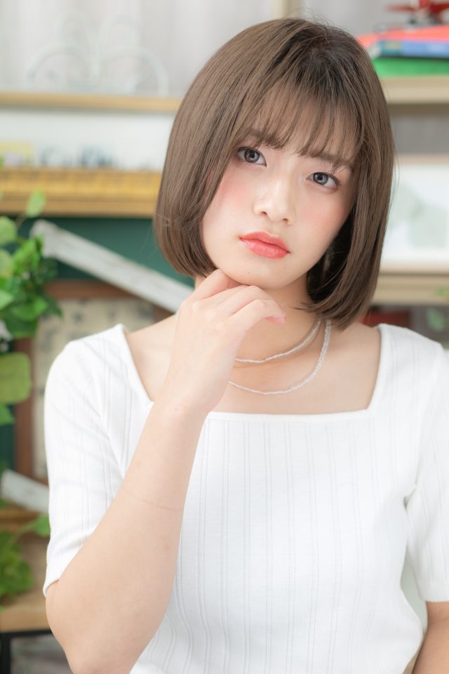斜めバング厚めバング、かきあげ前髪も大人かわいい。くせ毛風ゆるふわミディや耳かけ前下がりウルフで小顔に。ナチュラルボブやフェミニンボブ、大人ボブや前下がりボブ、ミニボブも人気。(メイク担当:川口店 岩淵)
