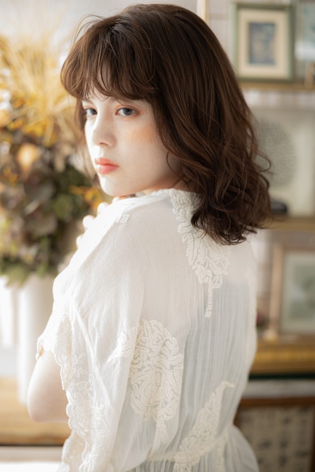 くせ毛風ゆるふわエアリーミディや耳かけ前下がりも大人かわいい。斜めバング厚めバング、シースルーバングかきあげ前髪で小顔。切りっぱなしボブミニボブ、大人ボブ前下がりボブも人気。(メイク担当:川口店伊与田)