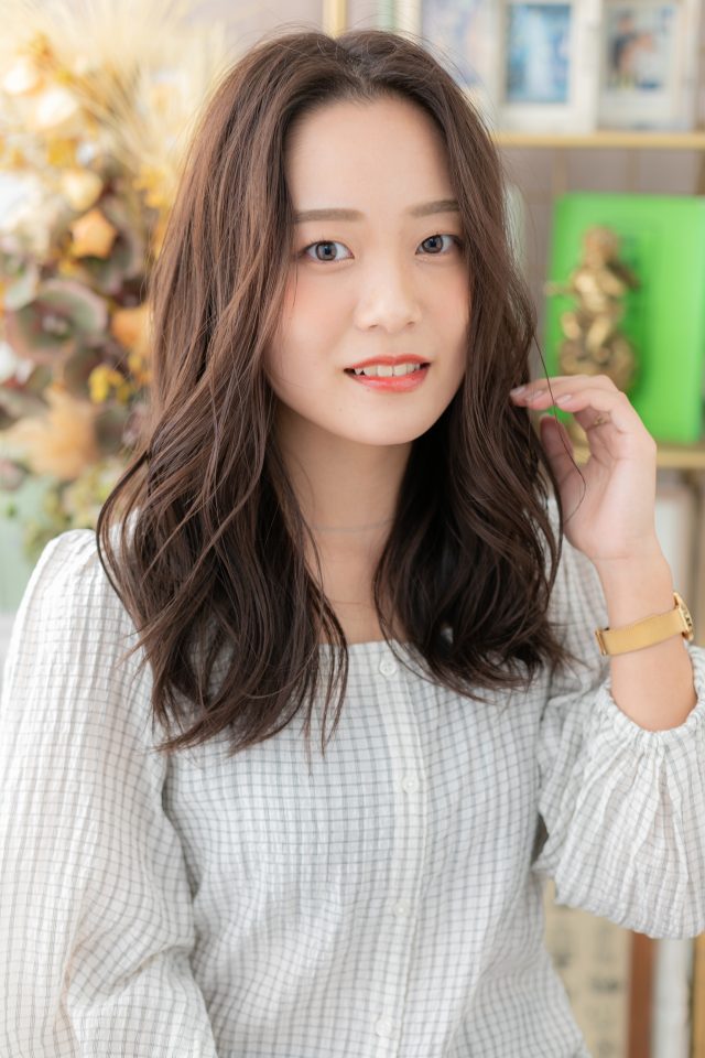 くせ毛風ゆるふわミディやエアリーミディからのイメチェンに◎耳かけアシンメトリー、前下がりや韓国風ウルフも大人かわいい。斜めバング厚めバング、シースルーバングかきあげ前髪で小顔。(メイク担当:川口店伊与田)