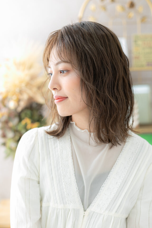 インナーカラーイヤリングカラー、バレイヤージュで外国人風。シースルーバングかきあげ前髪、斜めバング厚めバングで小顔。くせ毛風ゆるふわミディや耳かけ前下がりウルフも大人かわいい。(メイク担当:川口店伊与田)