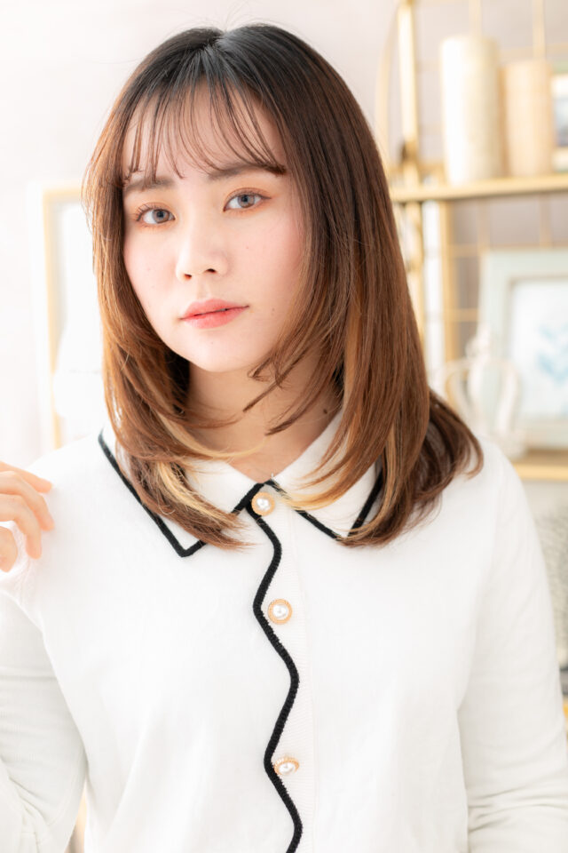 斜めバングやシースルーバング、うざバングや前髪パーマで目力強調。くせ毛風ゆるふわミディやニュアンスパーマも大人かわいい。耳かけアシンメトリーやセンターパートのヘアアレンジも小顔◎(メイク担当:川口店木村)
