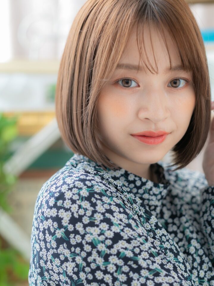 大人かわいいハイトーンカラーの韓国風ナチュラルボブ。フェミニンボブや大人ボブ、前下がりボブも人気。くせ毛風ゆるふわミディや耳かけ前下がりで小顔。斜めバングや厚めバングで目力UP。(メイク担当:北浦和店 成田)