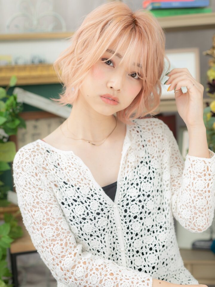 ハイトーンカラーとシースルーバングの韓国風ゆるふわミディ。斜めバングや厚めバングで小顔。前下がりや耳かけも大人かわいい。ナチュラルボブやフェミニンボブ、大人ボブや前下がりボブも◎(メイク担当:川口店伊与田)