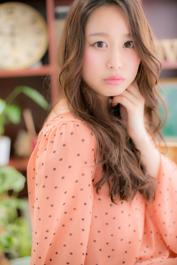 女子の憧れ♪触れたくなるツヤ感あるしっとりロング。リッチカールの重厚スタイルでも、斜めに流れる前髪で顔周りをクッキリ見せることで、重過ぎない甘めのフェミニンウェーブに★