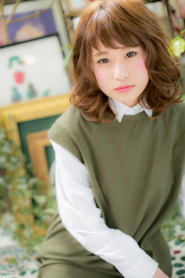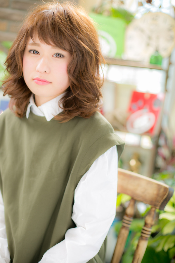 ランダムにかかったカールでふんわりボリュームたっぷりのミディアムスタイルです。前髪はスライドカットでシースルーな軽さをだして、バランスいい重軽スタイルに♪