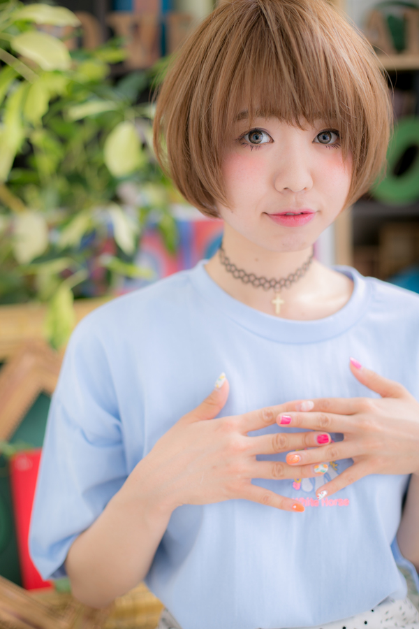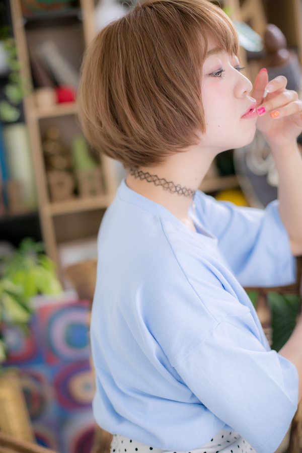 赤みのない透明感あるハイトーカラーでツヤ感を出した、コンパクトフォルムのナチュラルボブ。コロンとした可愛らしいシルエットが小頭効果も引き出します☆