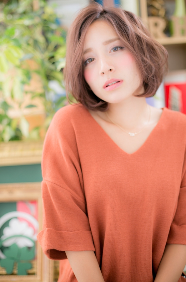 根元はふんわり乾かしてボリューム感も。ウェーブは少しウェットしてセット。ピンク系カラーで大人っぽさにカジュアルさもプラスされたフェミニンボブに。