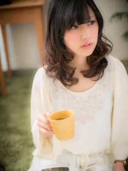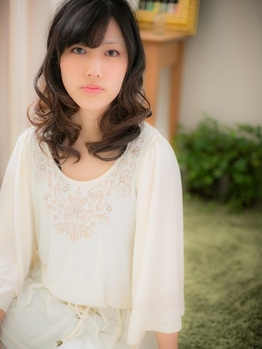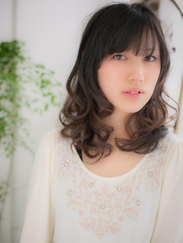 黒髪だけど、毛先にかけてのブラウングラデーションに♪黒にしたい、でも重いのはちょっと…という方にオススメのカラー。大きくカールを作ることによって、小顔効果も「大」。いつまでも愛され続ける定番パーマに今風のアクセントをプラス!!