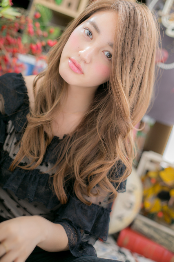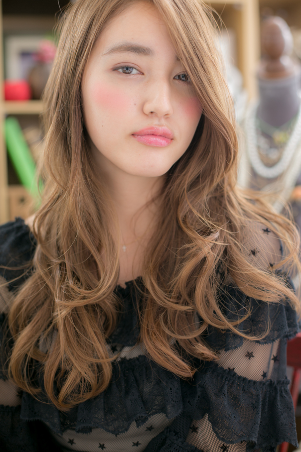 透明感ある明るめのベージュカラーと、海外セレブのようなたっぷりのボリュームカールで胸元を華やかにし、視線集中のモテロングに♪ざっくりまとめただけのスタイルも、色っぽさUP。