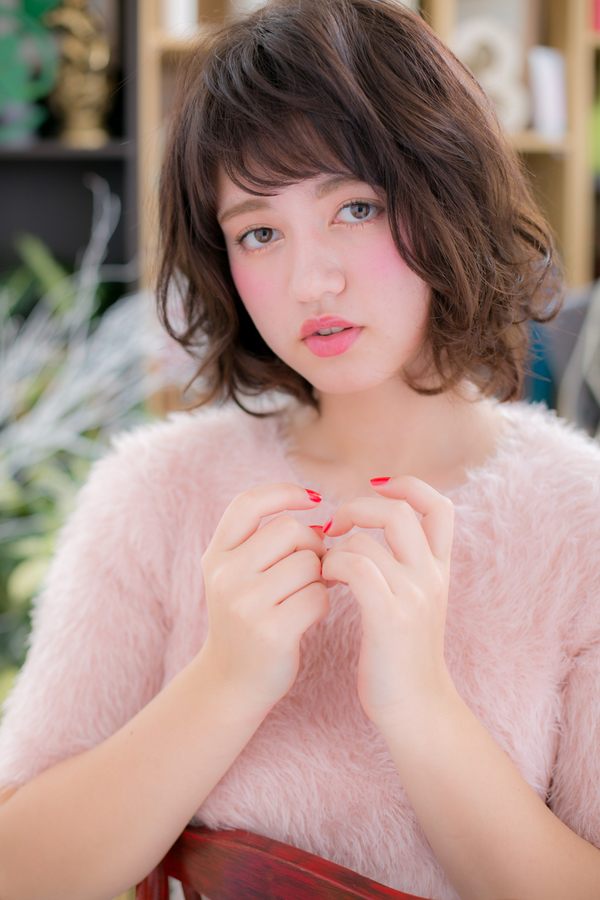 頬にかかるカールがやわらかな印象を醸すフェミニンボブ。高めの位置からパーマをかけることで、軽くてエアリーなゆるふわ感を演出します。