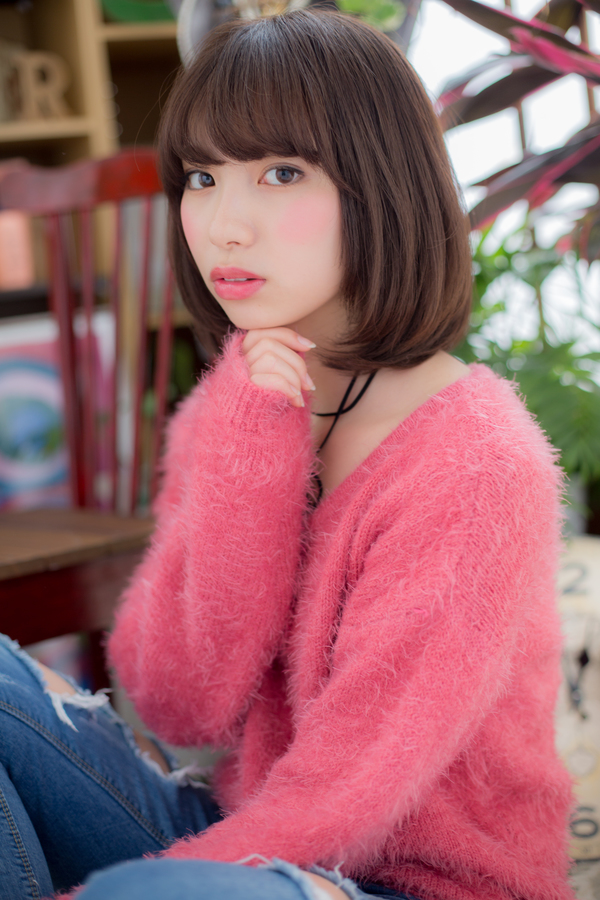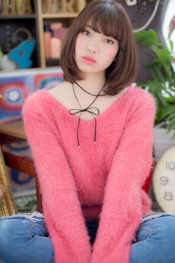 印象的なブラウン系の暗めカラーとぱっつんバングでぐんと存在感もUP!内巻きにまとまりやすくカットもされているのでハネにくくセットもしやすいです☆