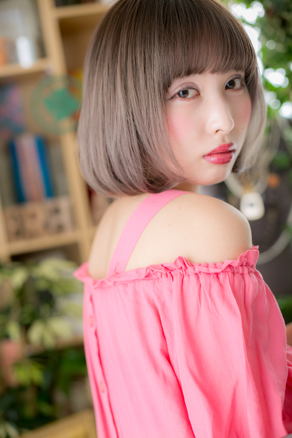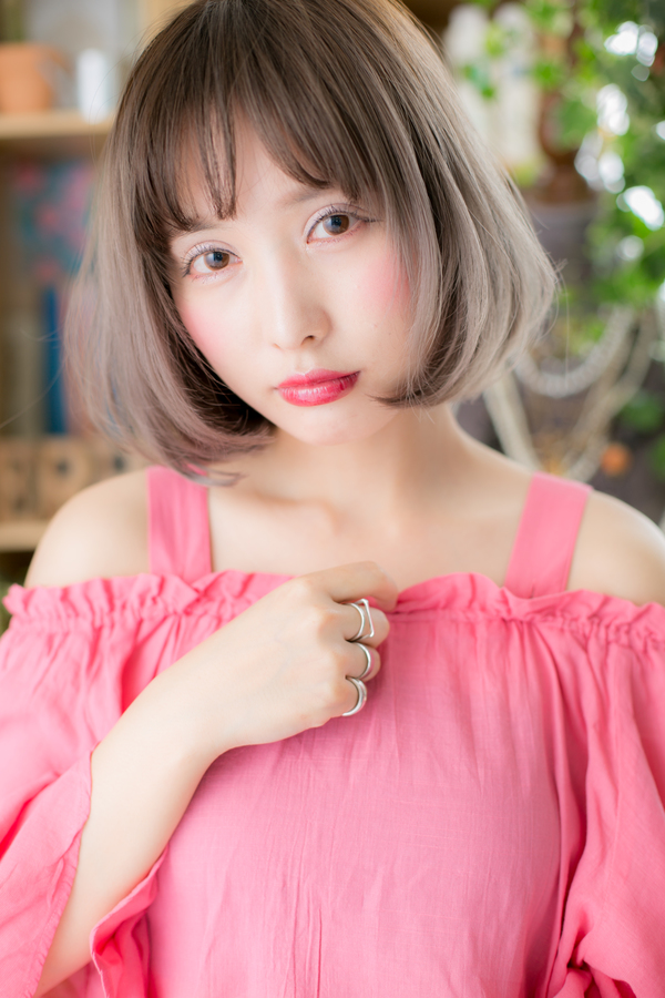 透け感あるフリンジバングやワイドバングで目元を強調して目力UP!頬を包み込むワンカールでフェイスラインをカモフラージュ。小顔に見せます。しっとりまとまるツヤ感を光を反射する透明感で、ハイトーンも上品に。