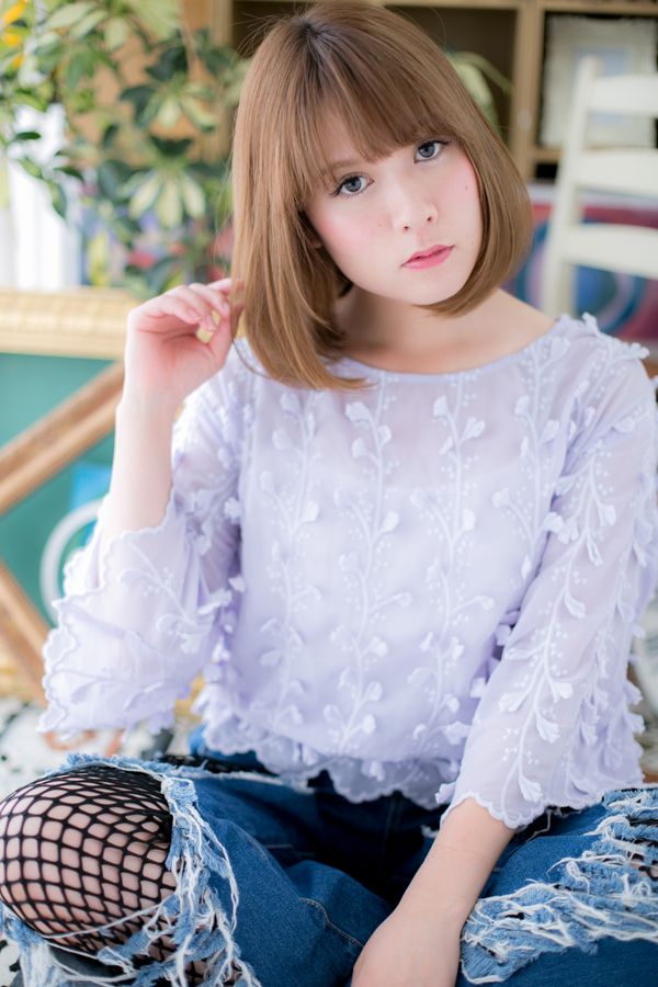 顔周りを包み込む前下がりラインで輪郭をカバーして小顔見せ。厚めバング&斜めバングで目元を強調して美人度UP!ナチュラルミディは、グラデーションカラーで表情豊かに個性的ガーリー☆(メイク担当:川口店 成田)