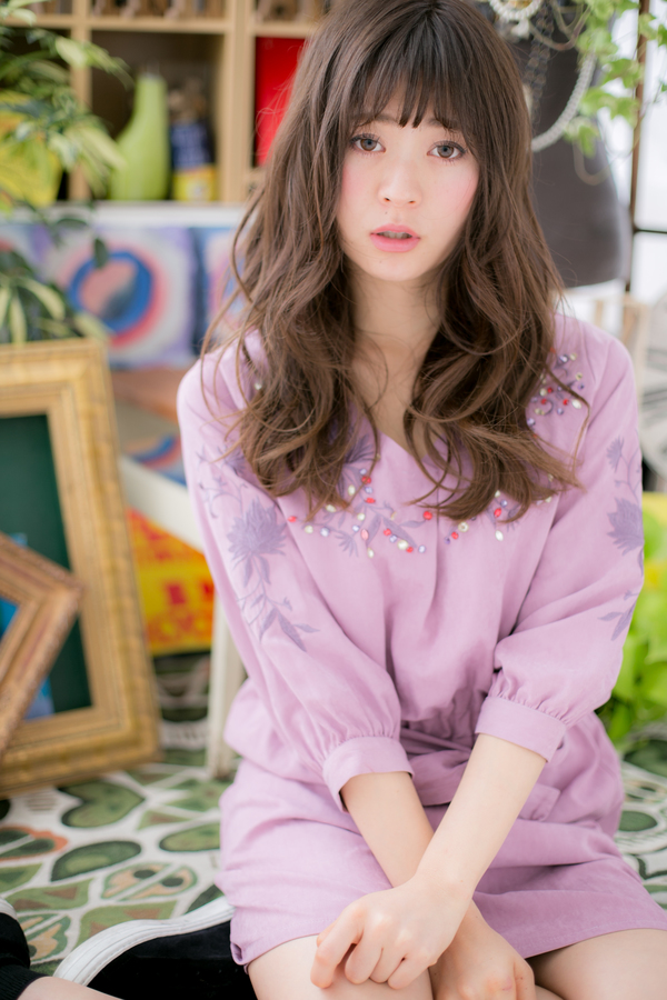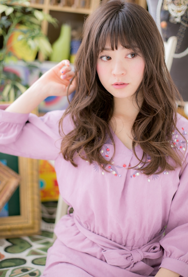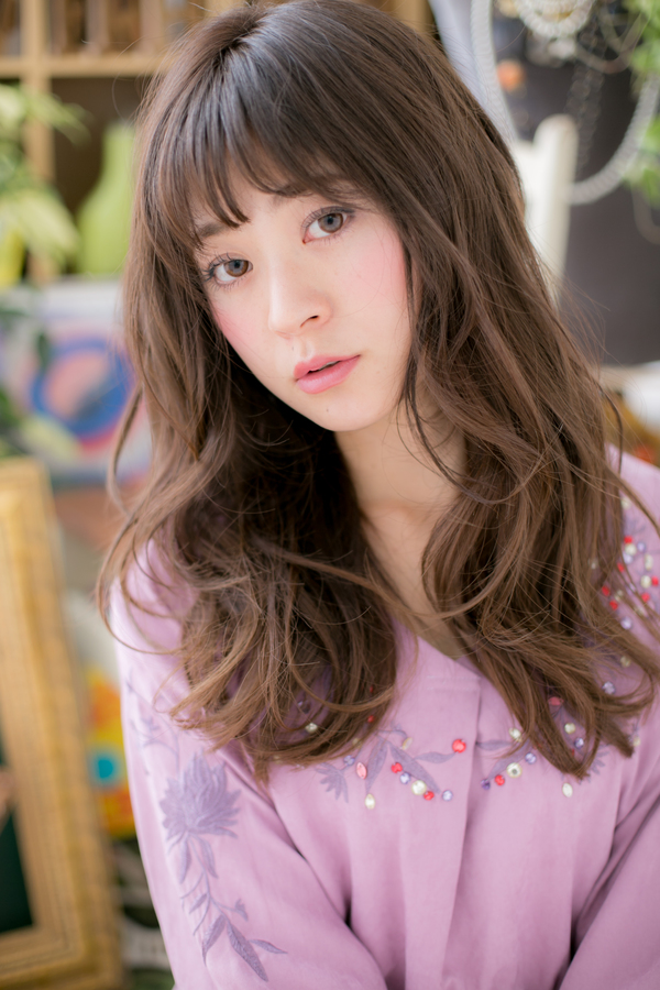 モテ要素満載のラブロングヘアスタイルです。。斜めバングや厚めバングで目力UPし、前下がりで小顔見せ。ボリュームカールでグラマラスにしたり、くせ毛風カールで抜け感を出してヘアアレンジしやすく、大人女子のコーデを完成◎耳かけも大人かわいい。髪の毛の色は黒や人気カラーもおすすめ!(メイク担当:川口店 成田)