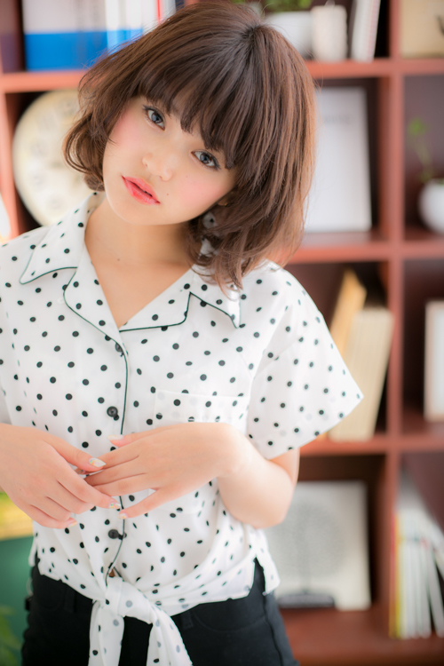 ひし形フォルムで空気を含んだゆるカールが軽やかなふわふわミディ♪適度なルーズ感の中に、厚めバングで可愛さをプラス。