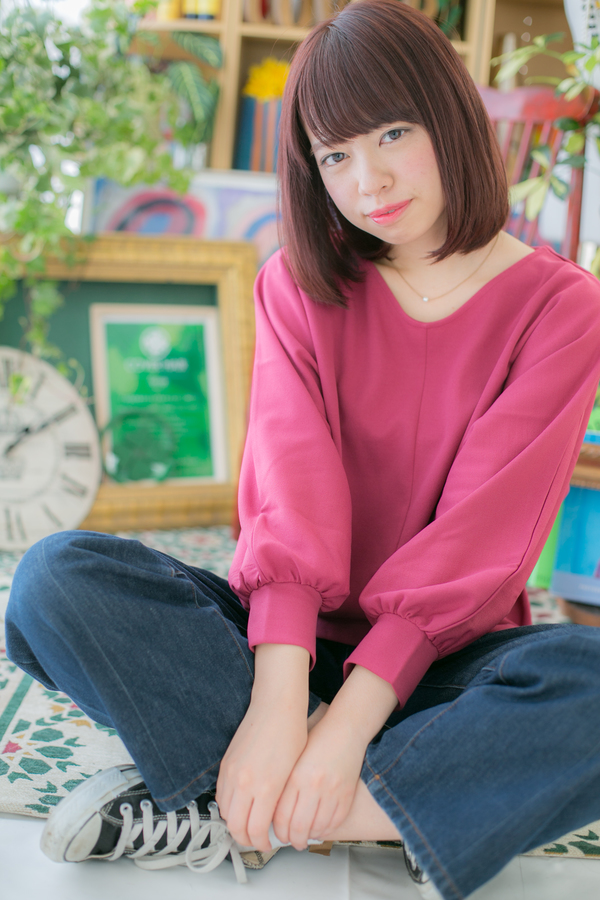 個性的カラーでピュアガーリーな雰囲気で大人女子のコーデを完成♪目力強調の斜めバングや厚めバングで女子力UPのヘアスタイルに!前下がりで小顔に仕上げて。くせ毛風のふわミディやラフな質感の切りっぱなしボブも大人かわいい☆ミディアムヘアを際立たせるグラデーションでトリートメントしたようなカラーリングで髪の毛の悩みも解決!30代・40にもおすすめ!(メイク担当:北浦和店 棟方)
