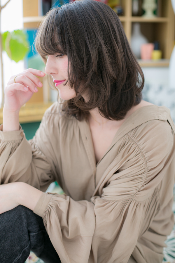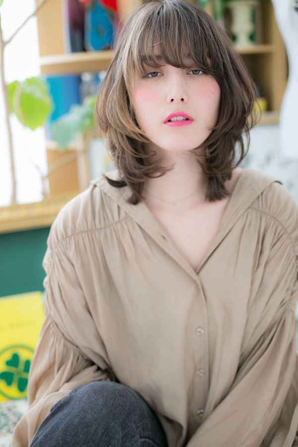 長めにセットした斜めバングで目力UPのヘアスタイル。抜け感ラフミディは前下がりで小顔に見せて大人女子のコーデを完成。耳かけや厚めバングも大人かわいいヘアアレンジ。ミディアムヘアが際立たせるグラデーションやベージュで髪の毛の悩みも解決!30代・40代にもおすすめ!(メイク担当:川口店 成田)