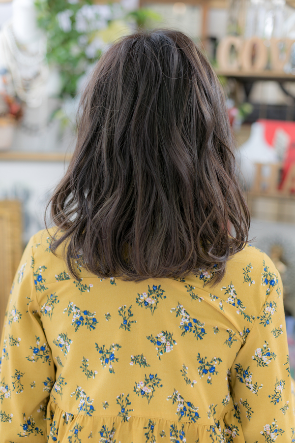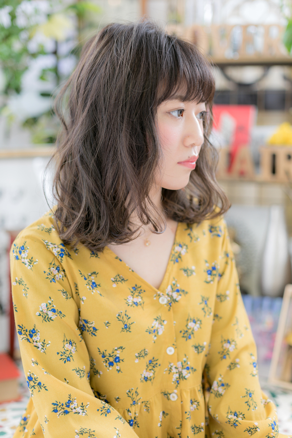 ワンカールをベースに表面にパーマをプラスしたモテ愛されヘアスタイル♪束感バングで目力UPで大人女子のコーデも完成!透明感あるベージュやミディアムヘアを際立たせるグラデーションの暗めの髪の色もおすすめ!40代のエラ張り対策にも◎(メイク担当:川口店 岩渕)