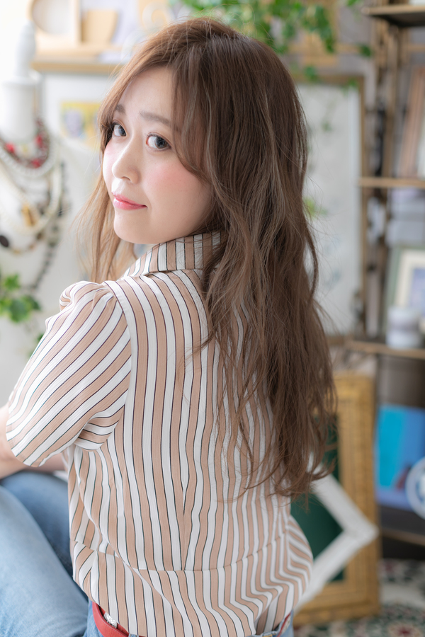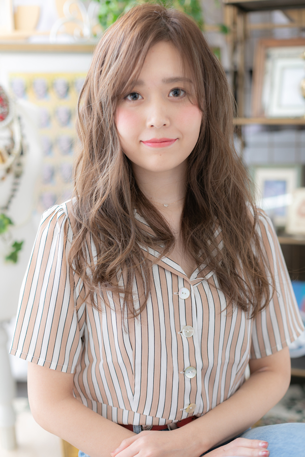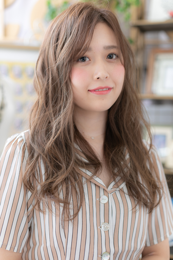 やり過ぎないくせ毛風ラフウェーブでラブカジュアルな印象で大人女子のコーデを完成。ハイライトで立体感と動きを出すのもオススメ。グラデーションカラーやベージュで外国人風グラマラス暗めの髪の色もおすすめ!40代のエラ張り対策にもGOOD(メイク担当 川口店 岩淵)